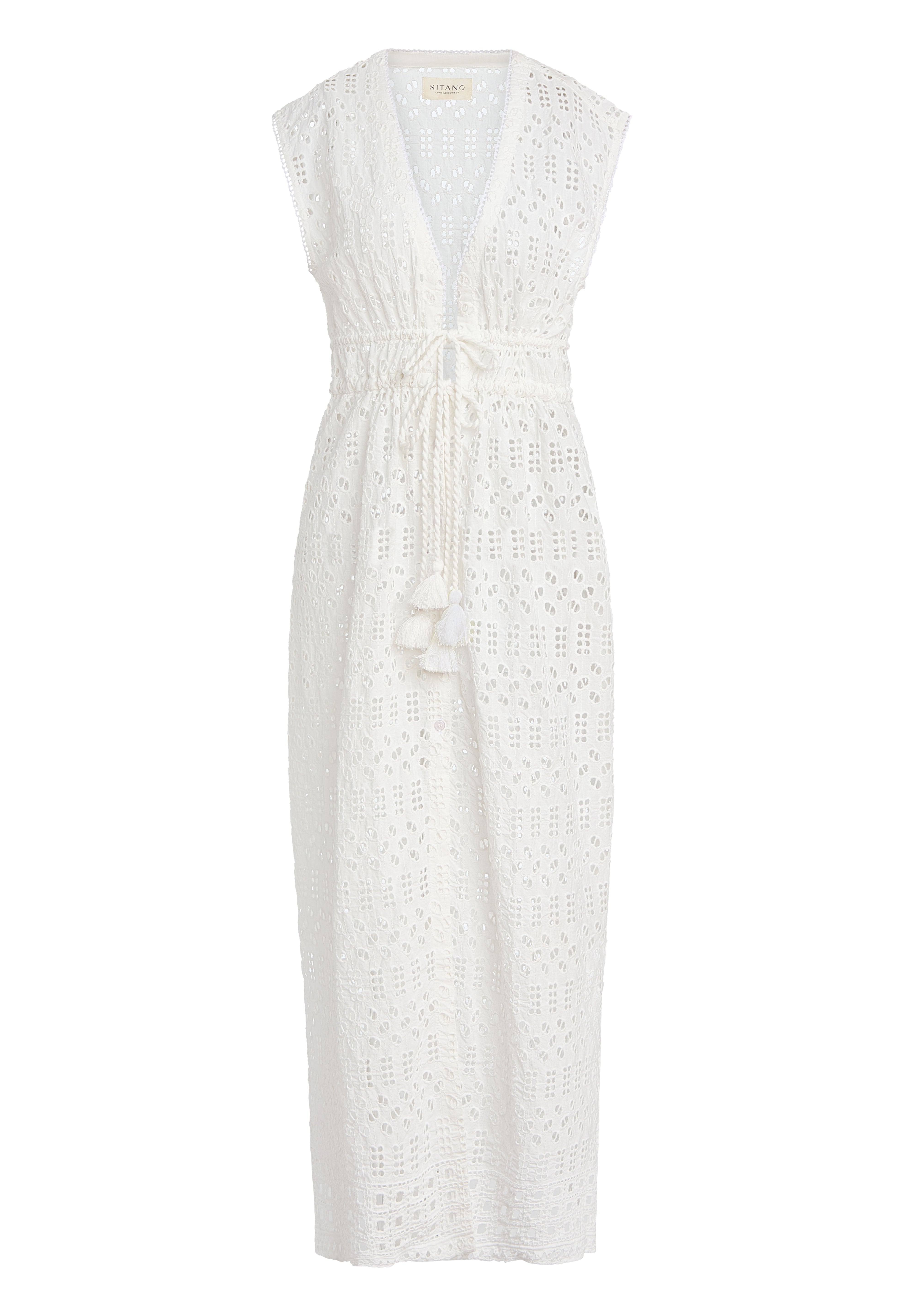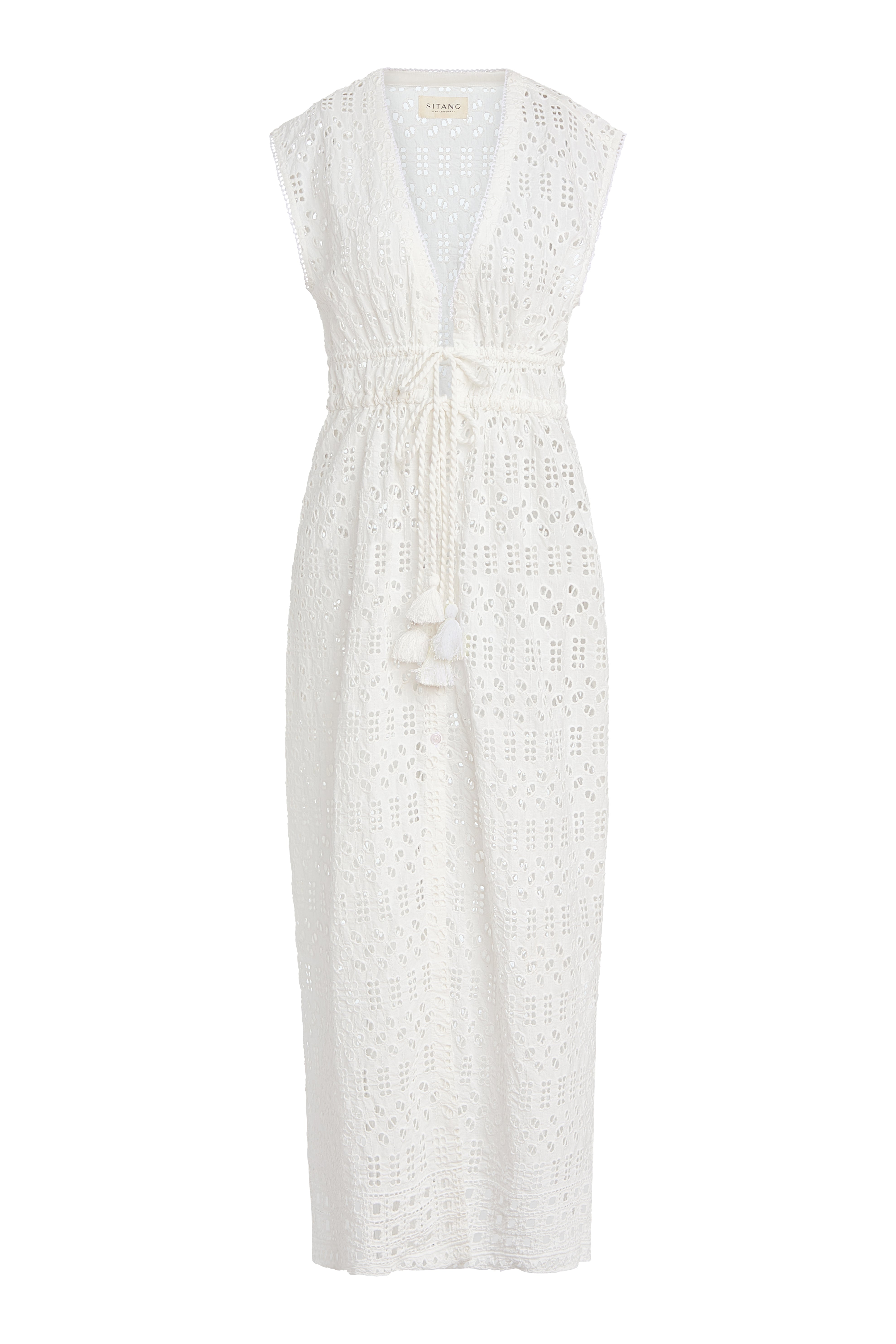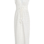 Elevate your vacation style with the Fontelina Dress—an effortlessly chic cover-up designed with eyelet fabric, a flattering double drawstring waist, and a discreet chest clasp for added coverage. Thoughtful details make this piece a standout, leaving you feeling confident, comfortable, and beautifully put together.