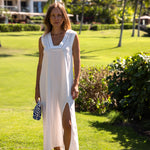 This sleeveless midi dress features the Sitano slit in the front and can be worn as a dress or as a cover-up. The cotton-rayon-linen blend fabric is extra soft and airy for a warm weather destination. The details around the square neckline are the perfect accent to a timeless dress.