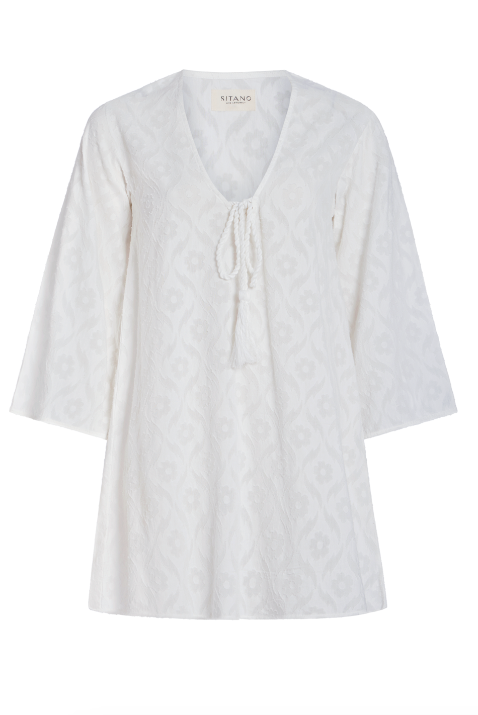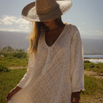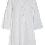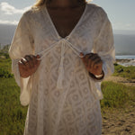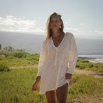 A true cover-up dress that goes with any swimsuit. The Siena Bell Sleeve dress has a deep V neckline with a cord tie and tassels and the perfect short length. This airy cotton fabric keeps you cool and chic while on vacation.