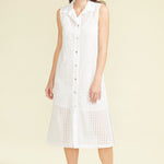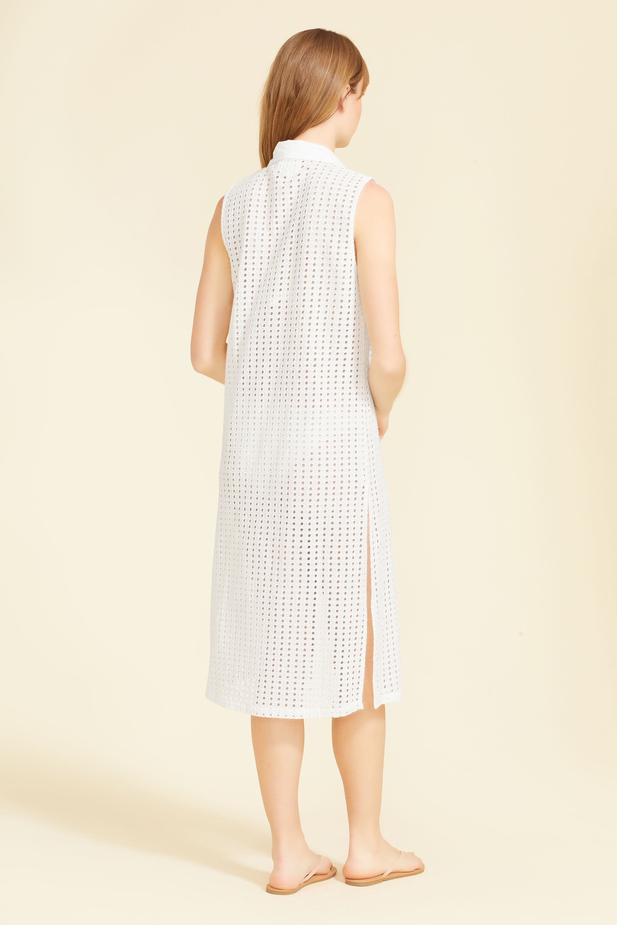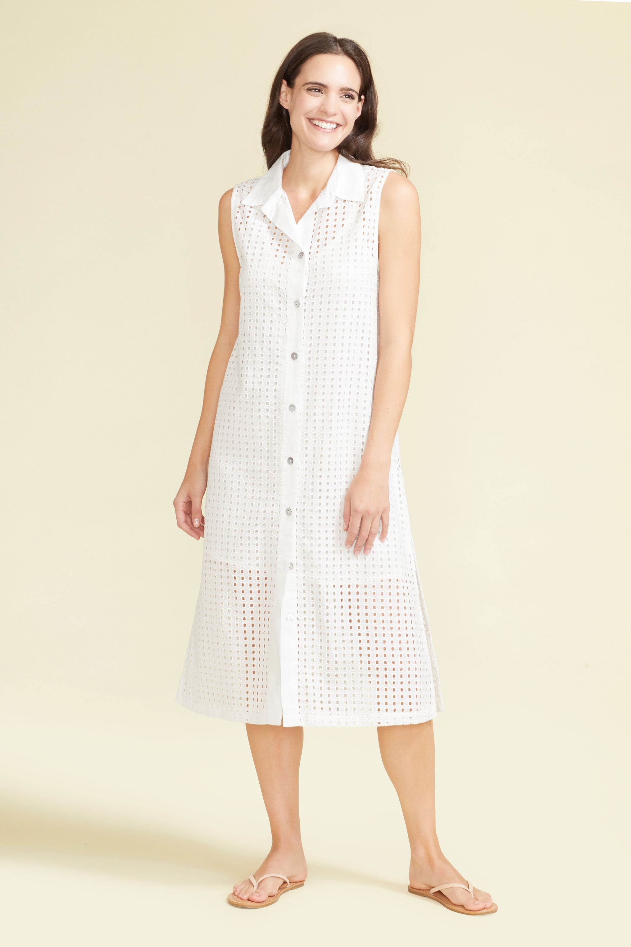 Made in a beautiful cotton eyelet, the Sofia dress is the ultimate sleeveless button down with a slimming silhouette. Paired with your favorite swimsuit, the Sofia Dress is perfect for the pool, beach, and beyond. It comes with an optional liner to wear as an everyday dress!